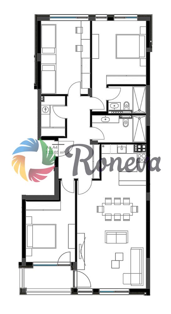 Апартаментът е 153 кв. м. на 4 етаж в новострояща се сграда и се състои от дневна с кухненски бокс, 3 спални, 2 бани с тоалетна, перално помещение, входно предверие, тераса.