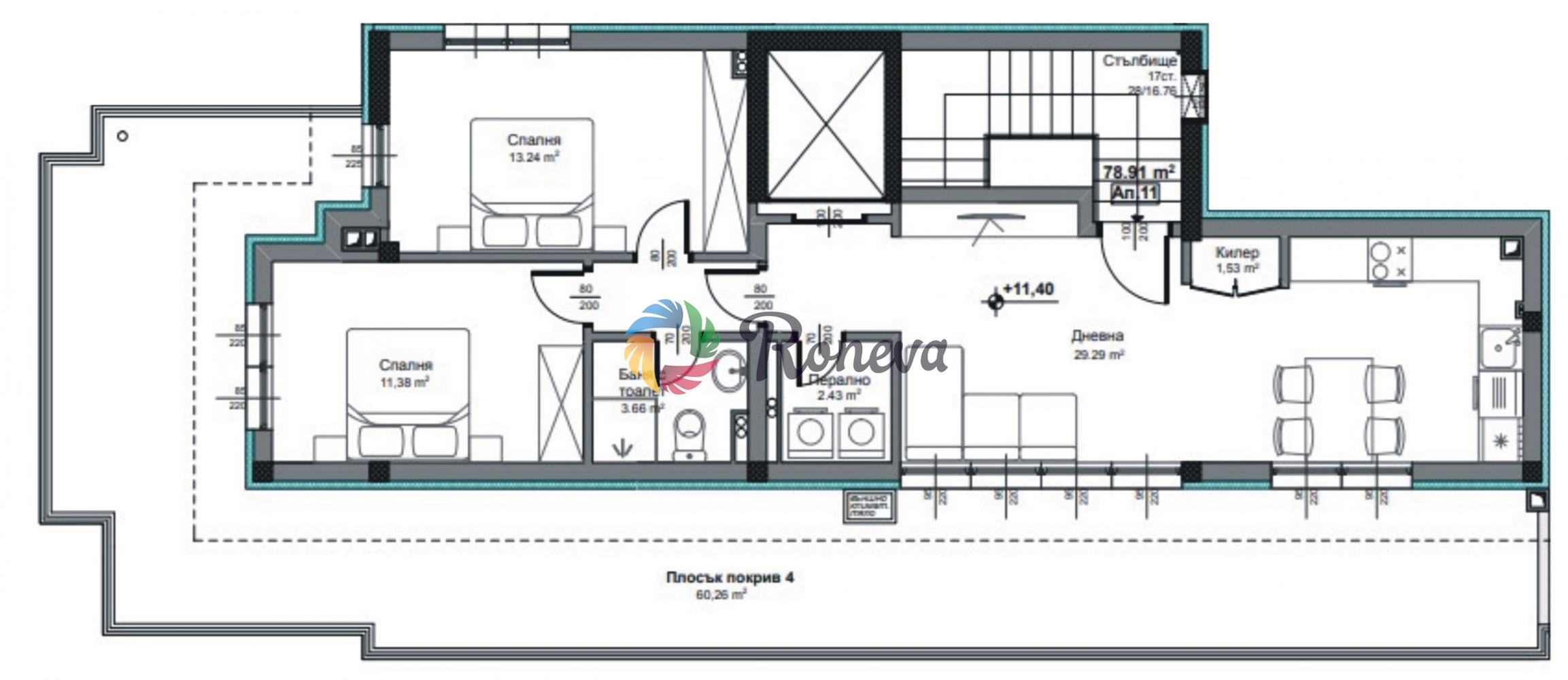 Апартаментът се намира пети жилищен етаж от пет и е тип пентхаус. Състои се от слънчева и просторна всекидневна с кухненски бокс, две спални, баня с тоалет, перално помещение и впечатляваша панорамна тераса.