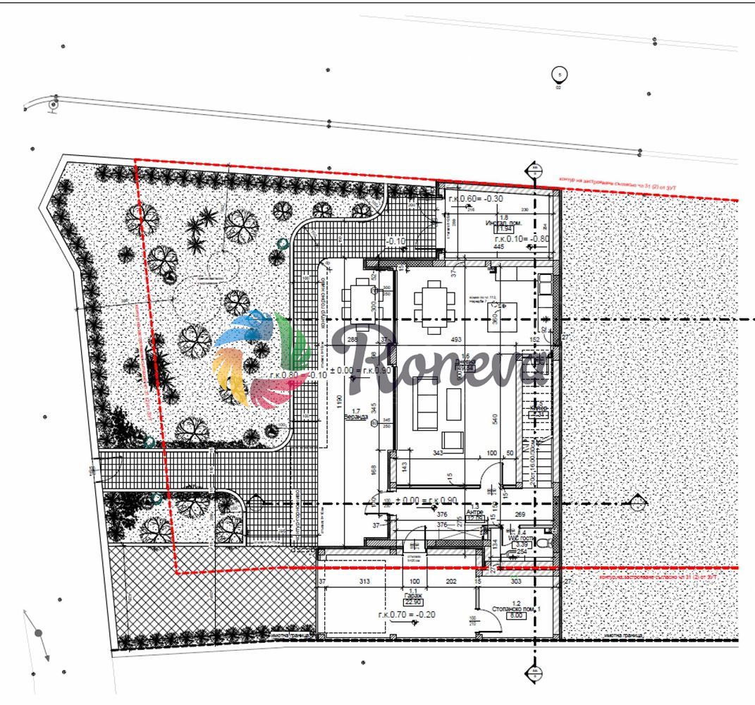 1 етаж: на 175 кв.м. са разположени дненвен тракт с кухненска част (50кв.), антре (12кв.), санитарно помещение обслужващо етажа (3.40кв.), гараж с топла връзка (23кв.), достъп до голяма веранда и две складови помещения.