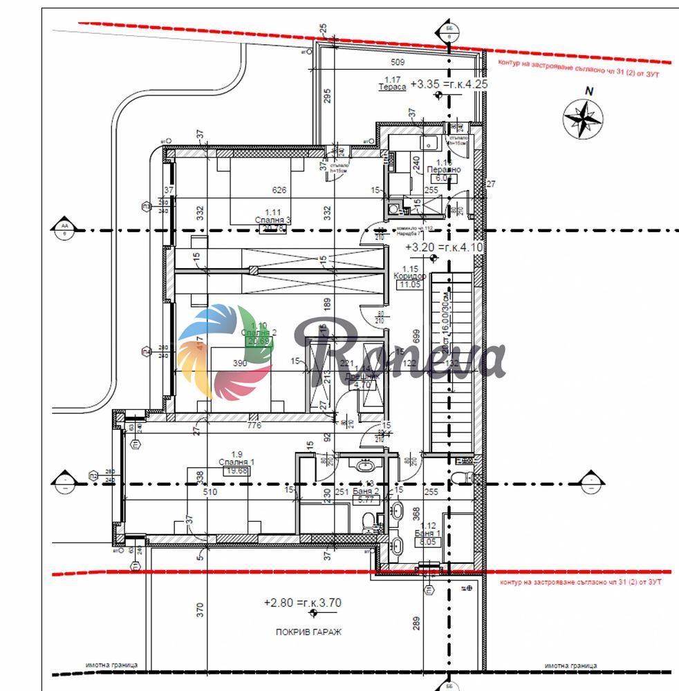 2 етаж: на 141 кв.м. са разположени три спални (по 20кв. всяка), две санитарни помещения (по 6 и 8 кв.м.) дрешник (4.70кв.), перално помещение (6кв.) и коридор (11кв.) и тераса.