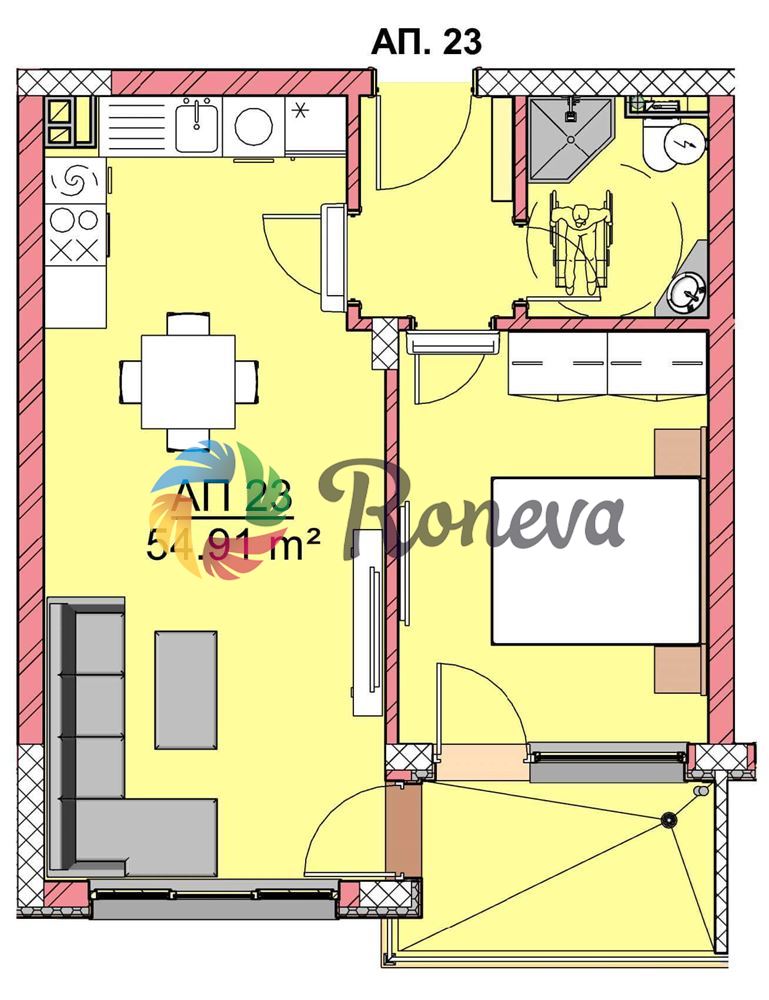 Разпределение: коридор, дневна с кухненски бокс, спалня, баня с тоалетна, килер, балкон с прекрасна панорама и южно изложение. Степен на завършеност по БДС, предварително изведени тръбни пътища за климатични тела, с входни врати блиндирани, с PVC дограма, Ел. и ВИК инсталации, и с възможност за завършване.