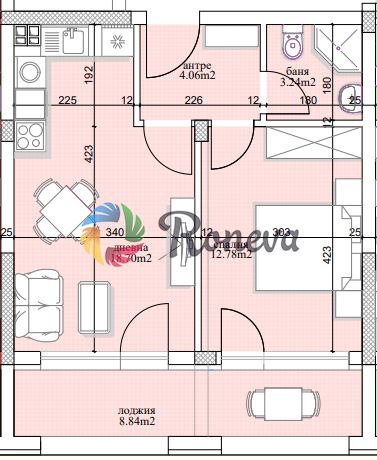 Жилището е разположено на партерен етаж от четири и се състои от антре, светла всекидневна с кухненски бокс, спалня, баня с тоалет и лоджия, която е обща за всекидневната и спалнята..