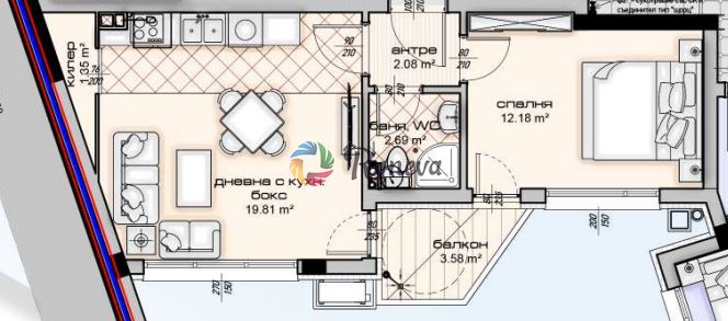 Апартаментът се състои от антре, дневна с кухненски бокс, спалня, баня с тоалет в едно и тераса с излаз от двете стаи. Жилището е функционално, помещенията са без скосове.