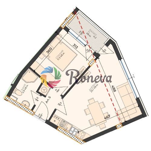 Състои се от антре, дневен тракт с кухненски бокс, спалня, баня с тоалетна и тераса.