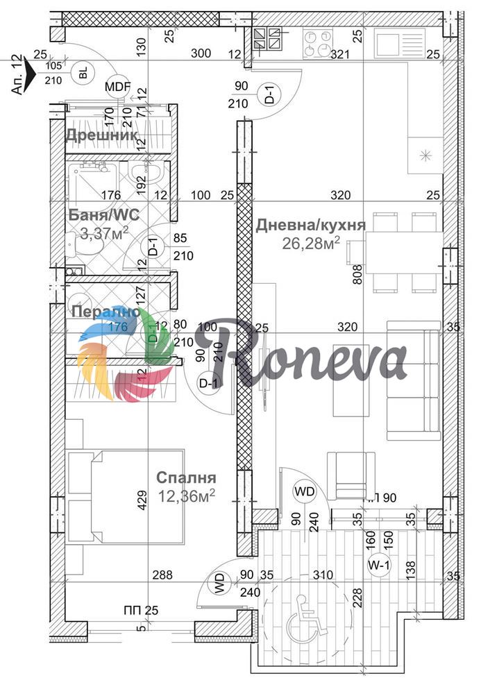 Жилището се намира на трети жилищен етаж от седем и се състои от входно антре с дрешник, голяма и светла дневна с кухненски бокс, уютна спалня, баня с тоалетна в едно, перално помещение и огряна от слънцето тераса с излаз от двете стаи. Помещенията са функционални с правилни форми, което улеснява проектирането на обзавеждане.