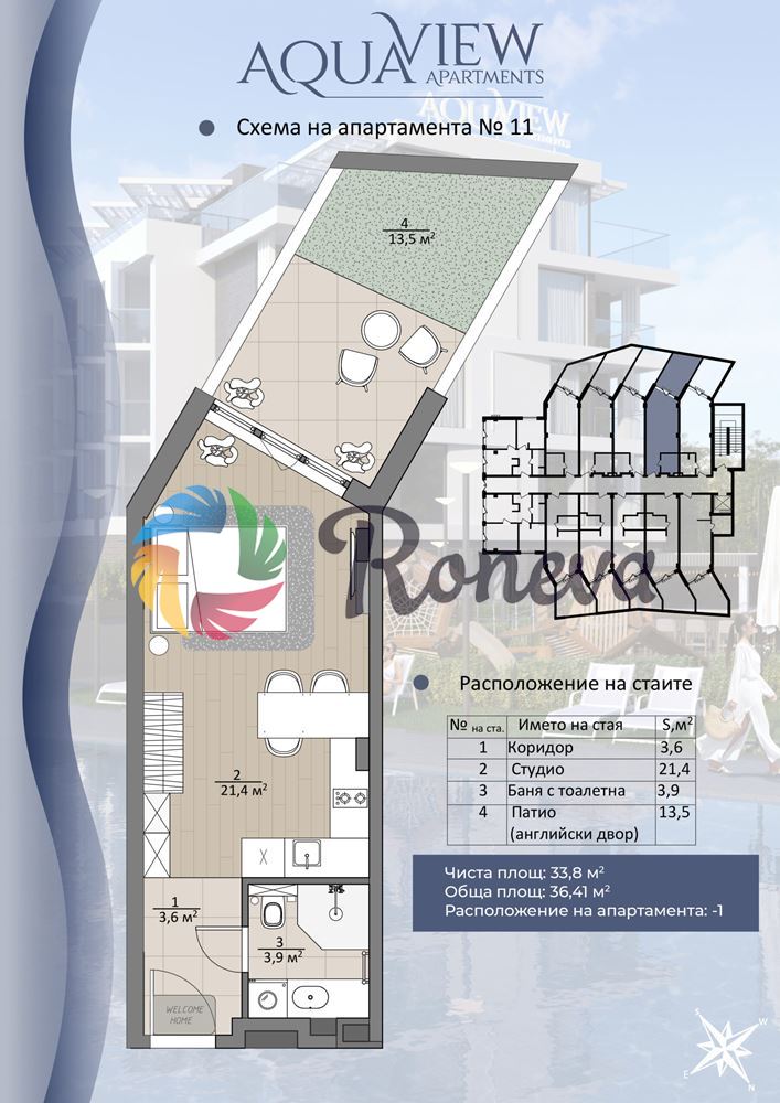 В сградата се предлагат едностайни, двустайни и тристайни апартаменти, както и паркоместа.