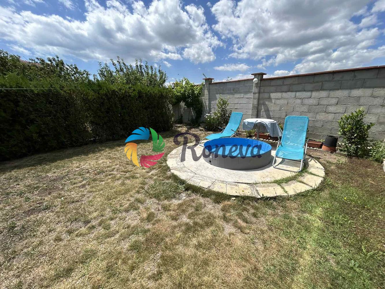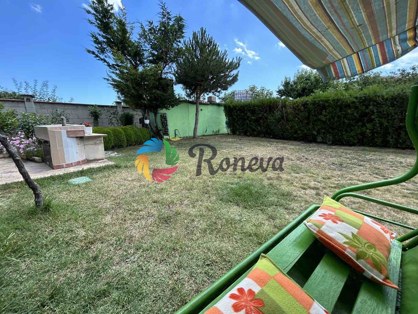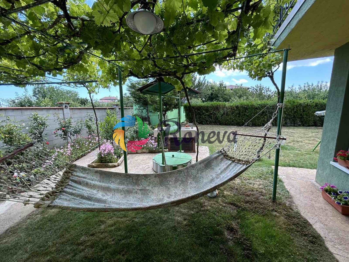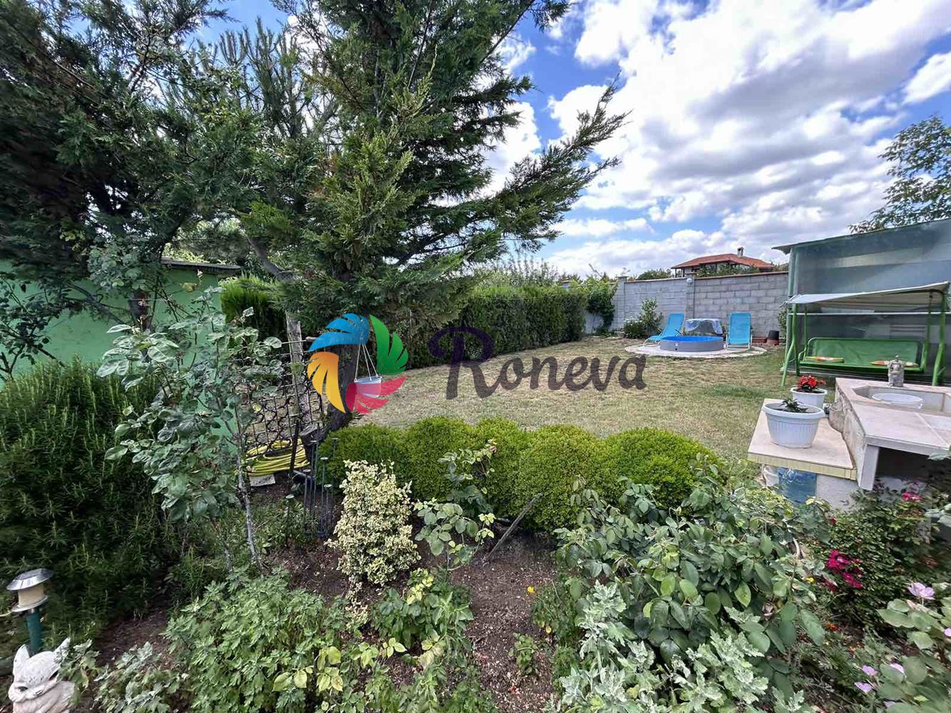 Към вилата има гараж с топла връзка към къщата и две открити паркоместа. Голям двор, добре аранжиран и поддържан със зона за отдих и овощна градина. Множество дървесни видове в овощната градина - сливи, ябълки, череши, круши, праскови и смокини. Дворът е с площ от 760 кв.м. и е изцяло ограден от двуметрова ограда за повече сигурност и уедиение. За повече информация и оглед се обадете и цитирайте код на обявата: