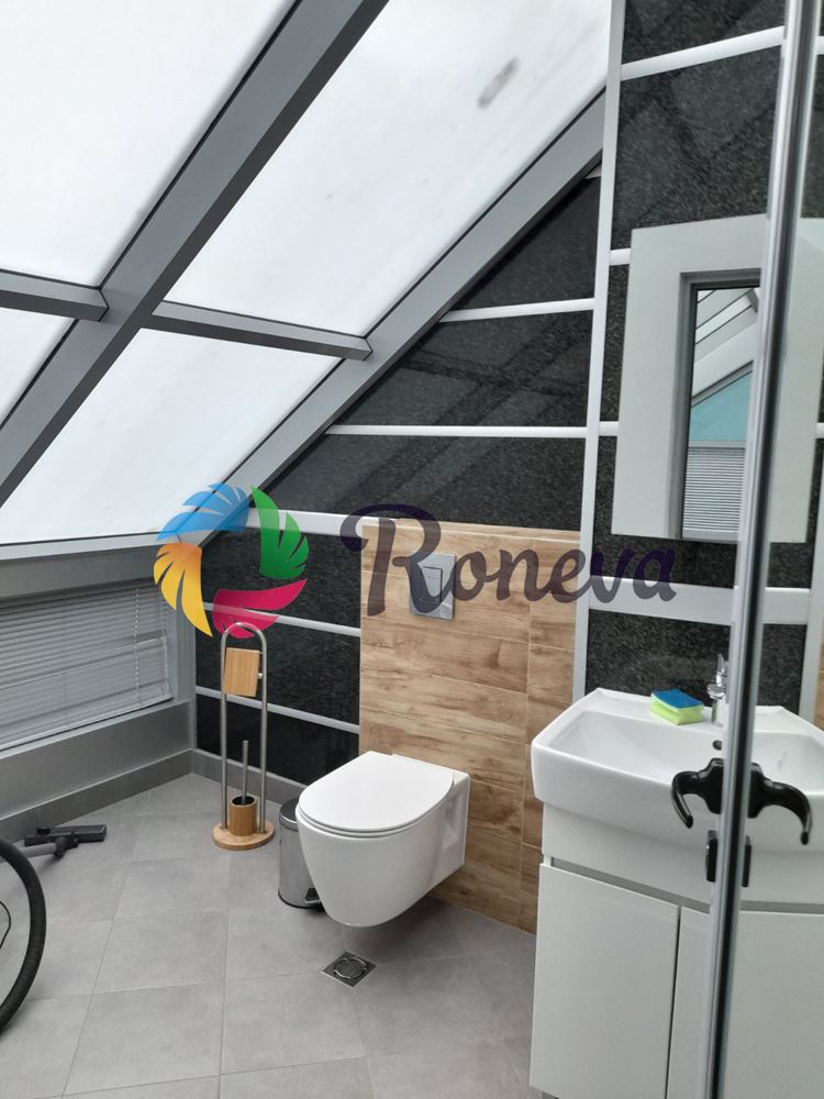 Разпределение : коридор ,рецепция ,пет самостоятелни зали ,две санитарни помещения , голяма тераса с панорама към града .