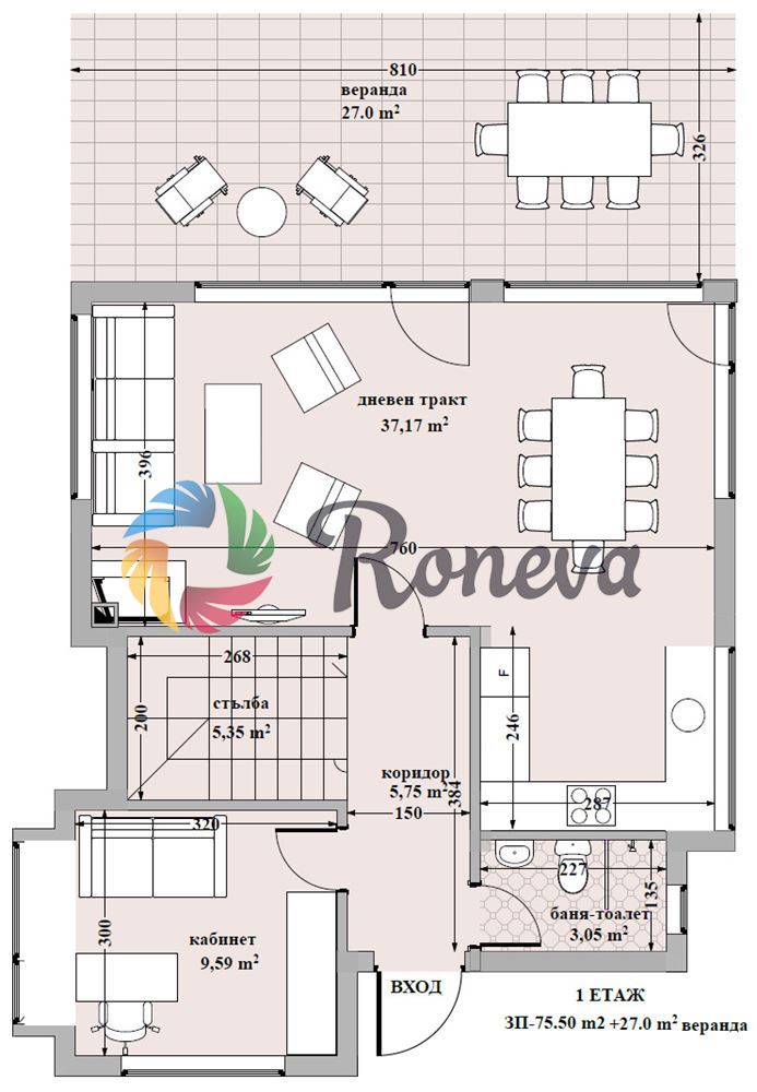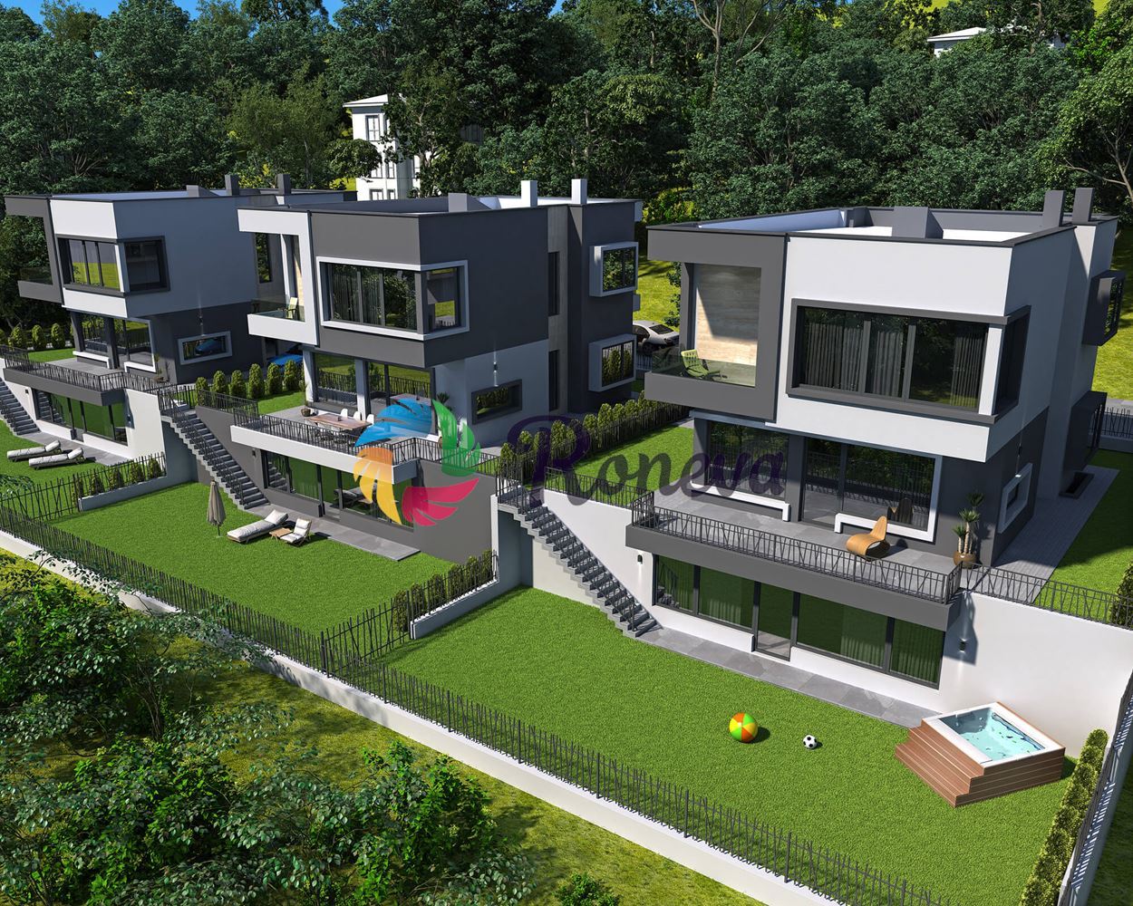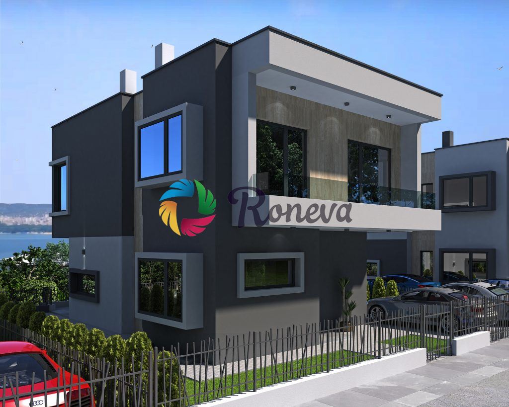 Продава се нова къща с модерна архитектура в спокоен район на 10 минути от центъра на града . Разпределение :