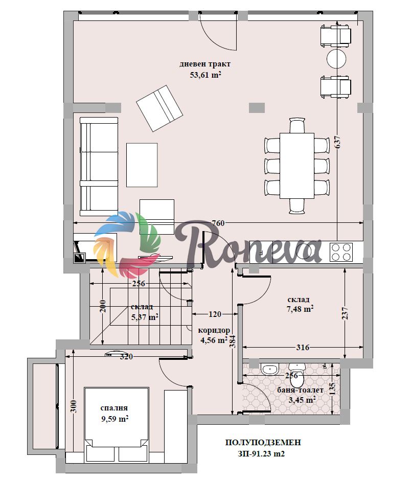 Самостоятелен етаж в основата на къщата с топла връзка за отделно домакинство или зона за забавления (билярд, домашно кино, механа, фитнес и други). Височина 2.60 м., жилищна площ 91 кв.м. Състоящ се от: голям дневен тракт 54 кв.м. (подходящ за разделяне) с директен излаз към долно ниво двор, стълбище, стая- подходяща за/ склад, маза, сауна или други функции/, спалня с английски двор, баня-тоалет, машинно помещение.
