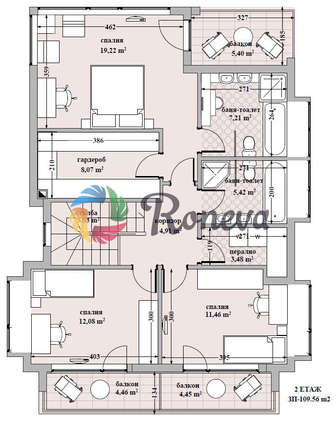 Втори етаж. Височина 3.40 м., 110 кв.м., състоящ се от: стълбище, две южни самостоятелни и широки детски стаи с прилежаща просторна тераса, перално помещение,коридор, баня-тоалет, широка и светла главна спалня 20 кв.м./с гардеробна, просторна баня-тоалет, покрита обемна тераса/. Естествено осветление в коридора от покривен прозорец VELUX.