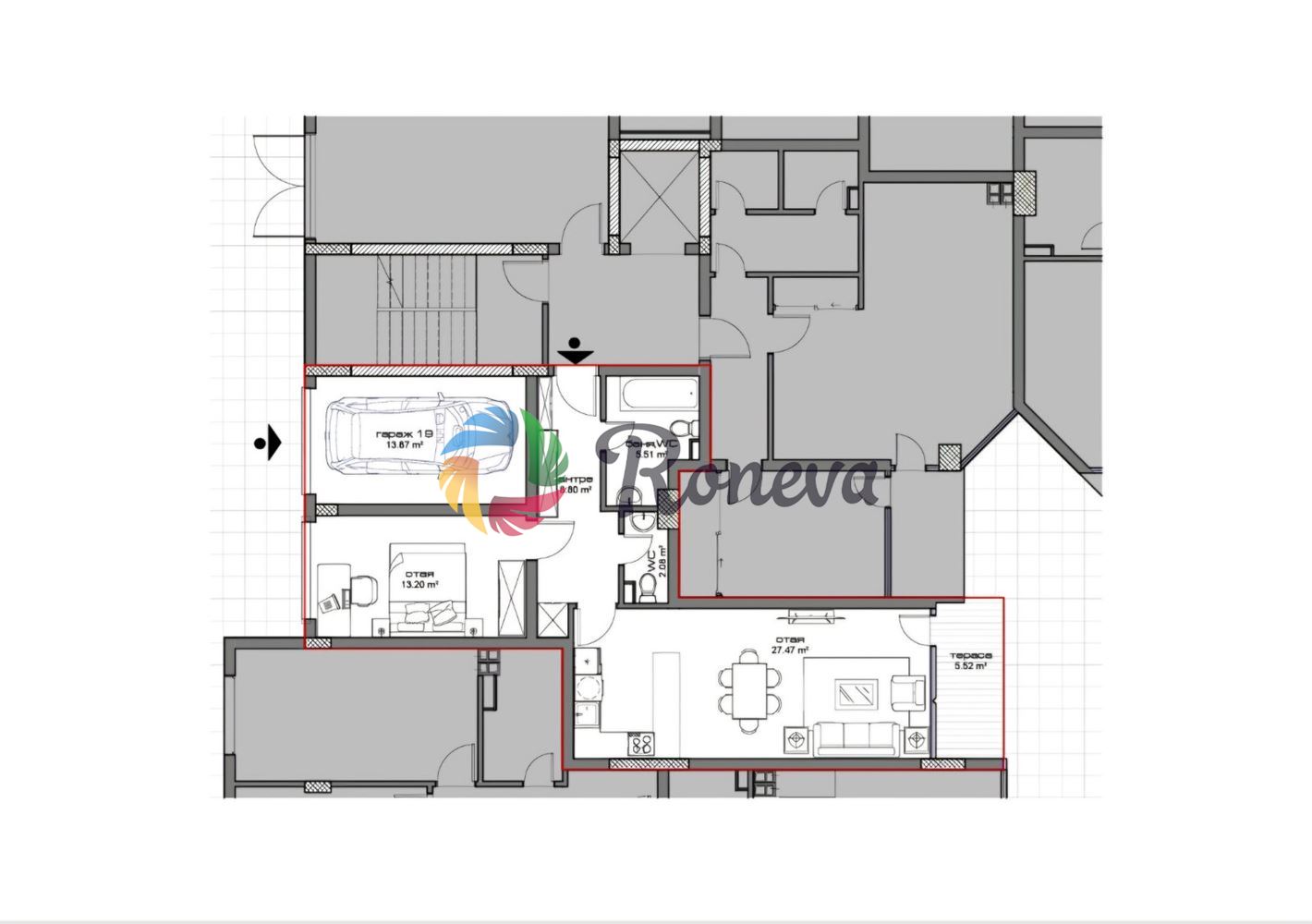 Разпределение ;коридор , зала тип Open space '' , баня с тоалет ,тоалет ,тераса ,два гаража .