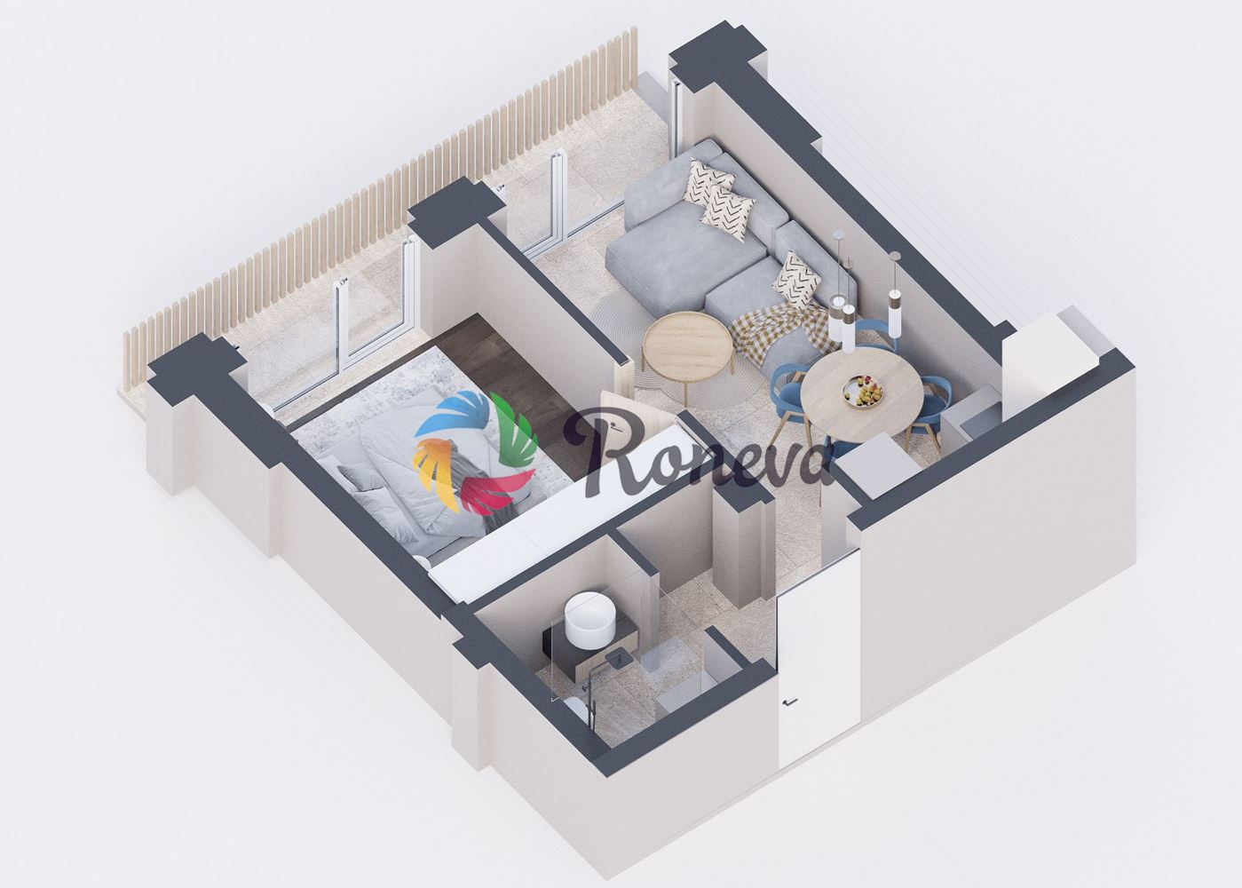 Апартаментът се намира на първи от общо пет жилищни етажа над партер и търговски помещения и се състои от входно антре, светла всекидневна с кухненски бокс, уютна спалня, баня с тоалет в едно и слънчева тераса.
