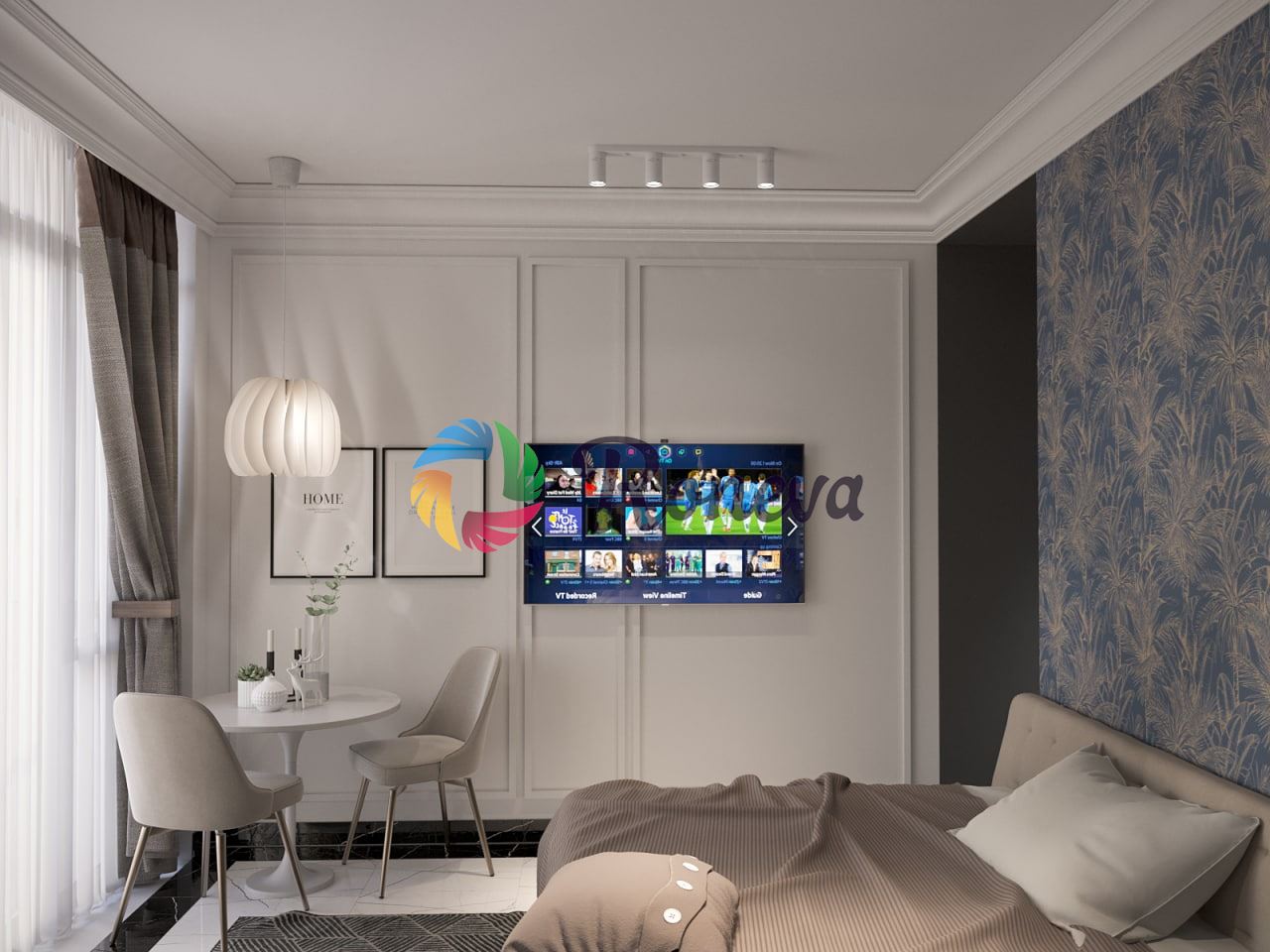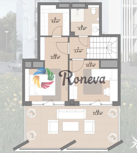 Жилището се намира на трети и четвърти жилищни етажи. На първо ниво са разположени входно антре, всекидневна с кухненски бокс, спалня, баня с тоалет в едно и две слънчеваи панорамни тераси към всяка от стаите. Второ ниво е разпределено по следния начин-две спални, голям дрешник, баня с тоалетна в едно и голяма панорамна тераса.