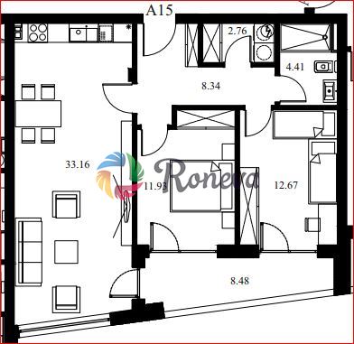 Жилището се намира на трети жилищен етаж от четири и се състои от входно антре, просторна и светла всекидневна с кухненски бокс, две слънчеви спални, като от всички стаи има излаз на тераса с панорамна морска гледка, баня и гоалет в едно и перално помещение или килер. Изложението на апартамента е изцяло юг, което допринася за оптимален приток на светлина и по-ниски разходи за отопление през зимния сезон.