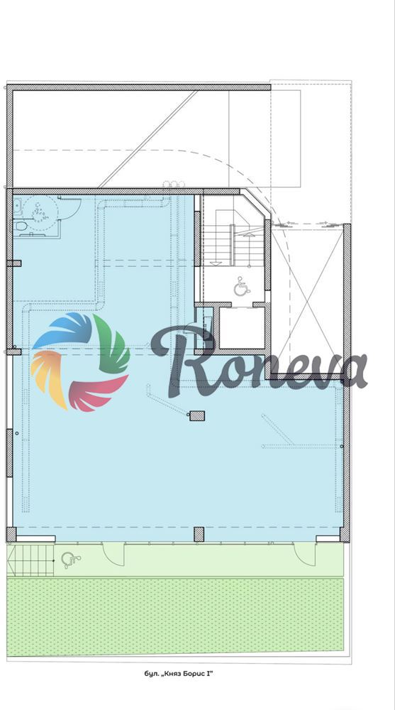 Разположено е на партерно ниво с голямо лице и витрина към бул. „Княз Борис I”