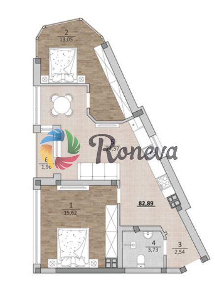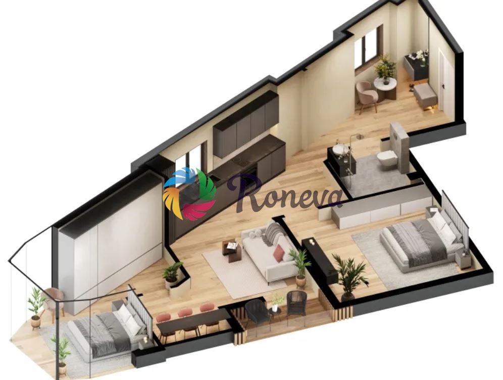 Апартаментът се намира на първи жилищен етаж над партер и се състои от антре, всекидневна с кухненски бокс, две светли спални, баня с тоалет в едно и тераса. Имотът е просторен и светъл, с разчупени форми, което предполага смели дизайнерски решения и обзавеждане.