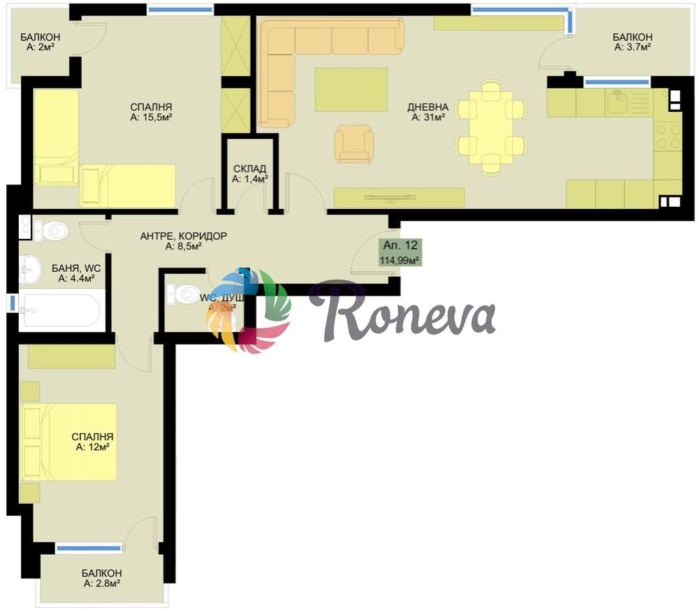 Просторен тристаен апартамент със следното разпределение :входно антре ,голяма дневна с кухня и трапезария ,детска спалня , родителска